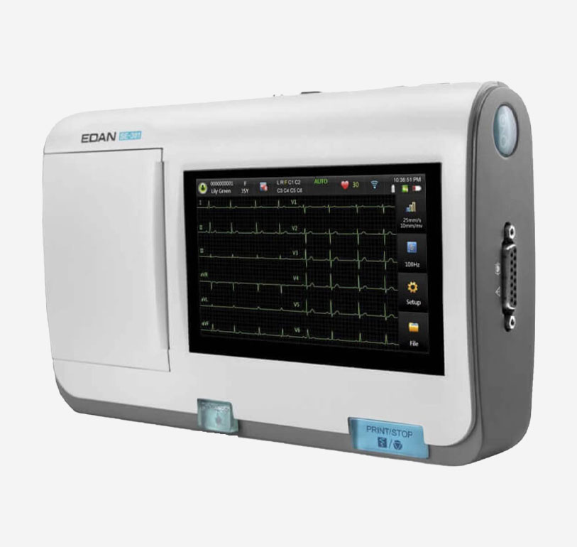 The Edan SE-301 is a reliable 3-channel resting ECG with a compact design and integrated thermal printer, making it ideal for mobile use. Its big multicolor touchscreen allows for a particularly user-friendly operation. SE-301 ECG supports 12 simultaneous leads, while color-coding on the display offers information about signal quality, enabling safe and precise diagnoses. External devices such as a barcode reader or an additional printer can be connected via the ECG’s USB ports.